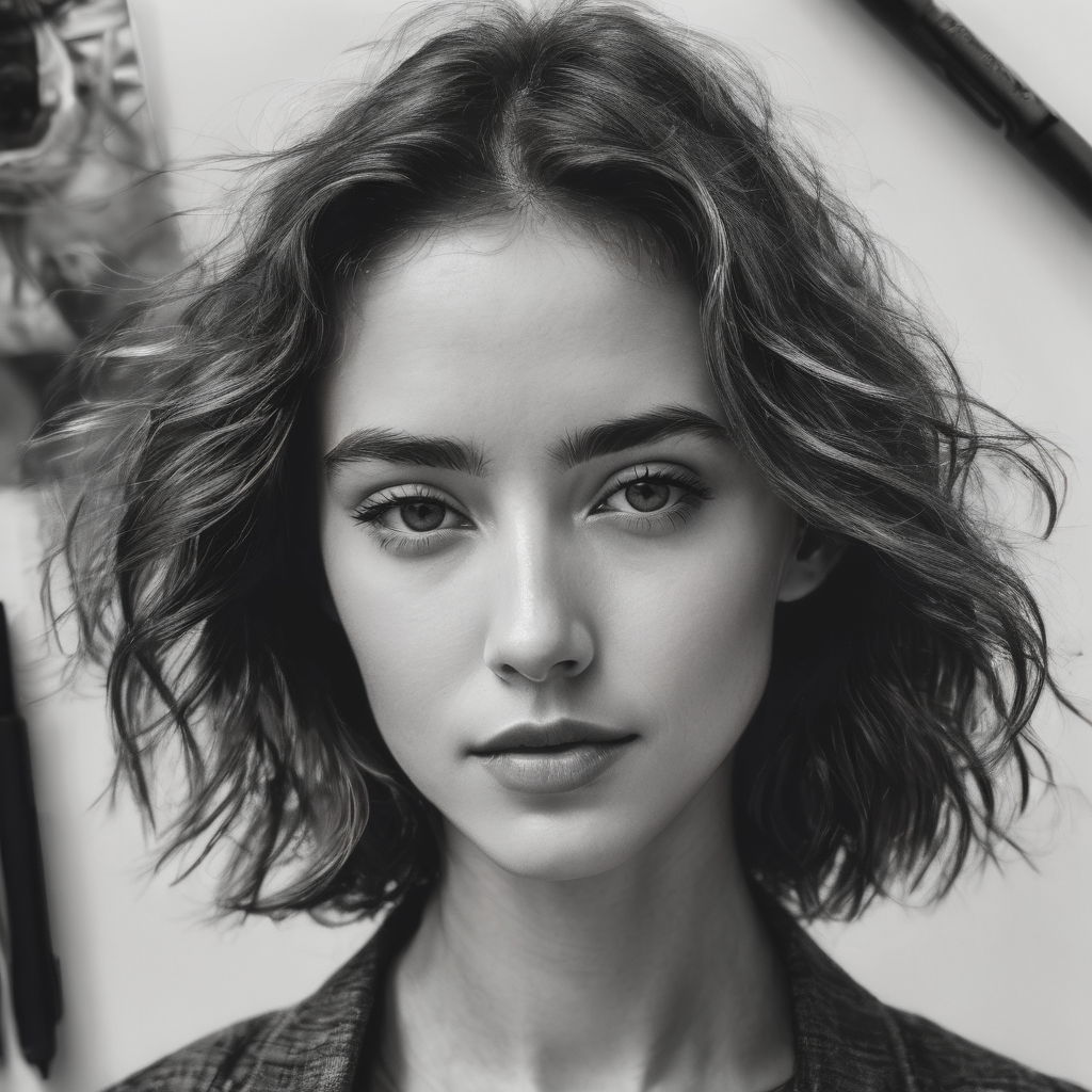 Radiating timeless elegance, a beautiful woman captivates with a forward gaze. Short strands of hair cascade freely down her neck, framing the delicate curve of her shoulder. Graceful and poised, she becomes a portrait of contemplative allure, with each feature harmonizing to create an image that transcends the fleeting moment. The subtle dance of her flowing hair adds an ethereal touch to the captivating tableau, revealing a blend of strength and serenity.