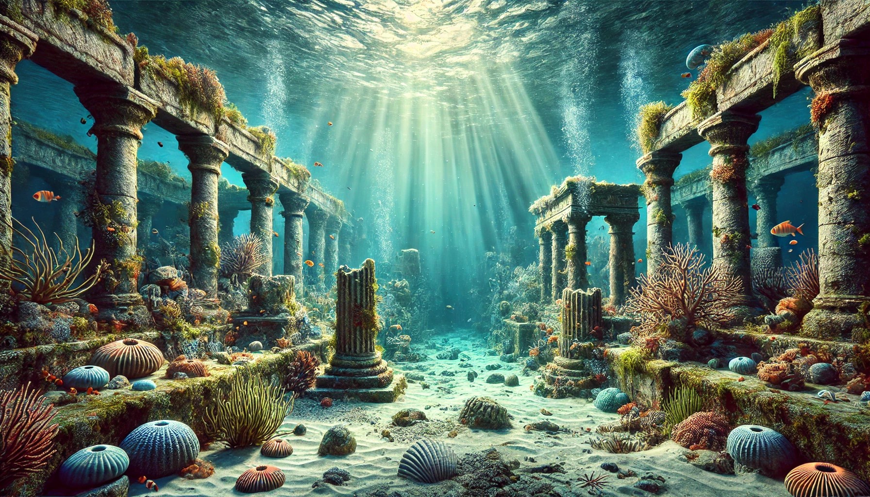 A hauntingly beautiful submerged ruin lies beneath the surface of a tranquil, crystal-clear ocean. Ancient stone structures, reminiscent of a lost civilization, are covered in coral, seaweed, and marine life. Crumbling columns, arches, and remnants of statues can be seen, partially buried in the sand and adorned with colorful anemones and shells.