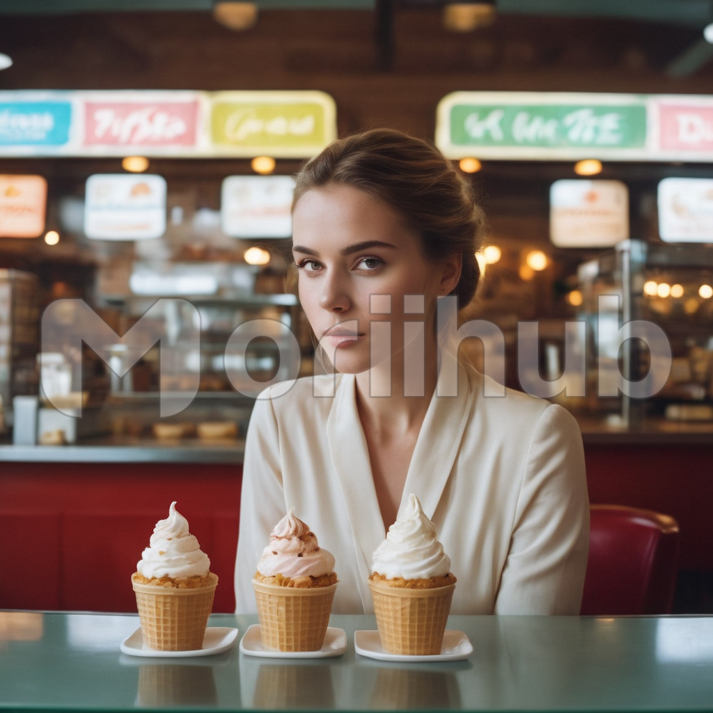 Amidst the cheerful atmosphere of an ice cream shop, a woman sits at a table, surrounded by an enticing array of frozen delights. The table before her is adorned with a tempting display of colorful ice cream options. Her eyes light up with anticipation as she contemplates the delightful choices, ready to embark on a sweet journey of flavors, and the air is filled with the joyous essence of indulgence in this frozen haven.