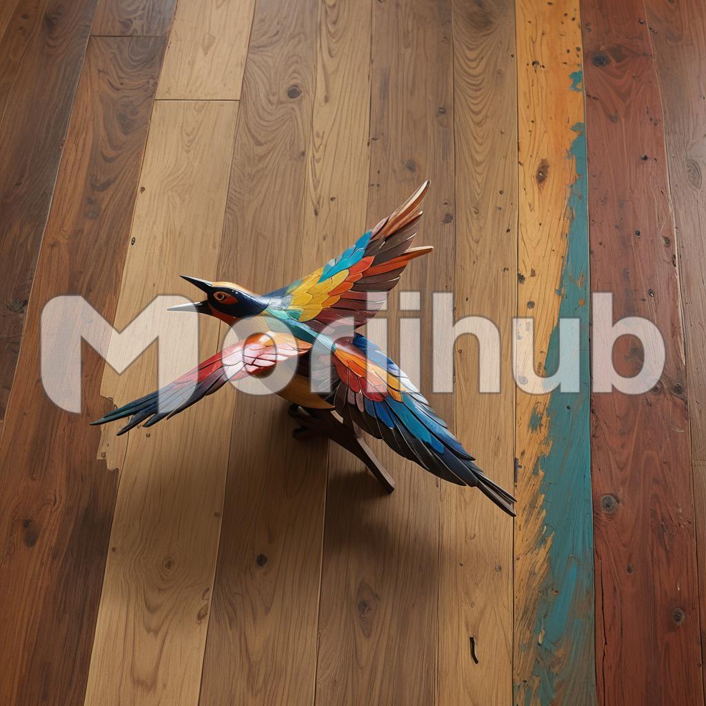 Painted in a rich palette of bold reds, deep blues, and bright yellows, the bird’s vivid colors bring it to life, making it a striking centerpiece. The texture of the wood, visible beneath the layers of paint, adds a natural warmth and organic feel to the piece. Its eyes, carefully detailed, seem almost alive with curiosity, while the delicate wings and tail are captured in a poised, lifelike stance. Set against the neutral tones of the table, the wooden bird stands out, drawing the eye and adding a cheerful, artistic touch to the room’s decor. This piece combines the beauty of nature with the skill of the artist, creating a vibrant focal point that invites