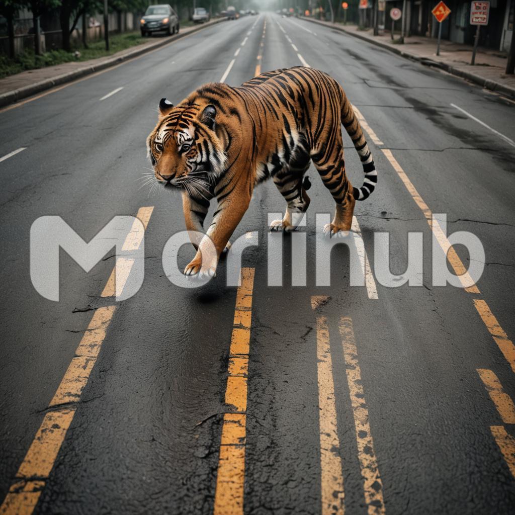 A tiger crossing a road evokes a surreal and powerful image of nature intersecting with human habitat. Its majestic stride, marked by stealth and grace, contrasts sharply with the asphalt and signs of civilization. This fleeting encounter reminds us of the wild’s resilience amidst encroaching development, urging respect for ecosystems that still harbor such iconic creatures, bridging our urban world with the untamed wilderness.