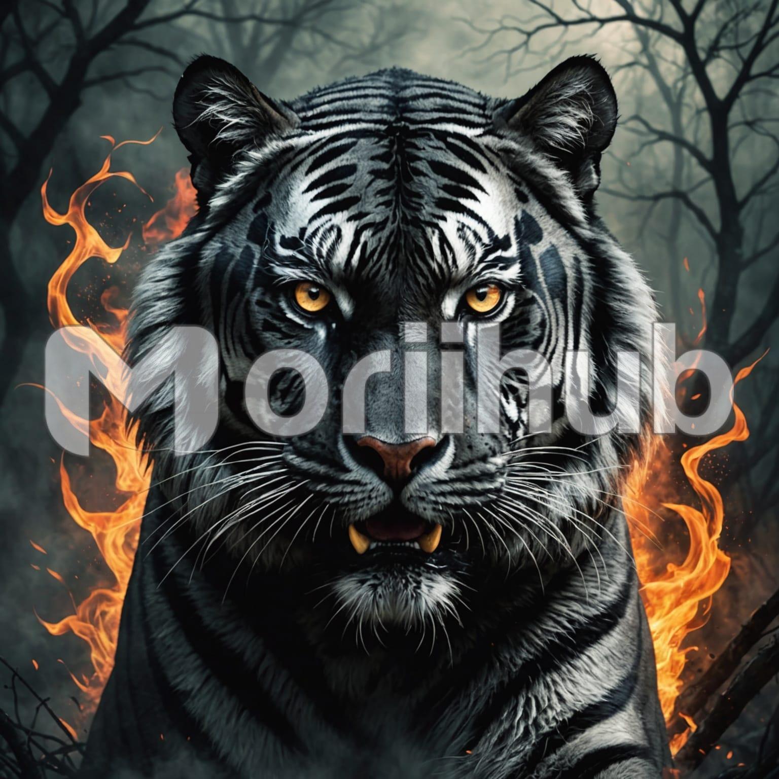 In the artful depiction, a majestic tiger gazes forward with unwavering intensity, its form enveloped in swirling flames that flicker and dance around its powerful physique. Behind the tiger, a dark forest emerges, populated by withered trees that stand as stoic sentinels in the fiery glow. The contrast between the tiger’s fierce presence and the desolate backdrop evokes a sense of primal strength and resilience. It’s a scene where nature’s raw beauty meets the elemental power of fire, capturing a moment of both danger and magnificence in the wild.