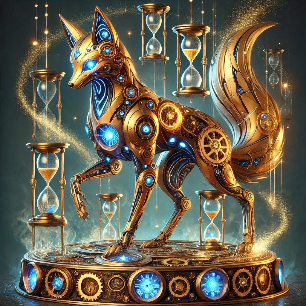 The Time Fox Automaton is an intricate and awe-inspiring construct, embodying the infinite flow and mysteries of time. Its sleek body is crafted from polished bronze and gleaming gold, accented with deep blue alloys that shimmer like the twilight sky. Its surface is adorned with intricate patterns of interlocking clockwork gears, flowing timelines, and hourglasses, glowing softly in hues of gold, azure, and faint silver, evoking the aura of temporal energy.