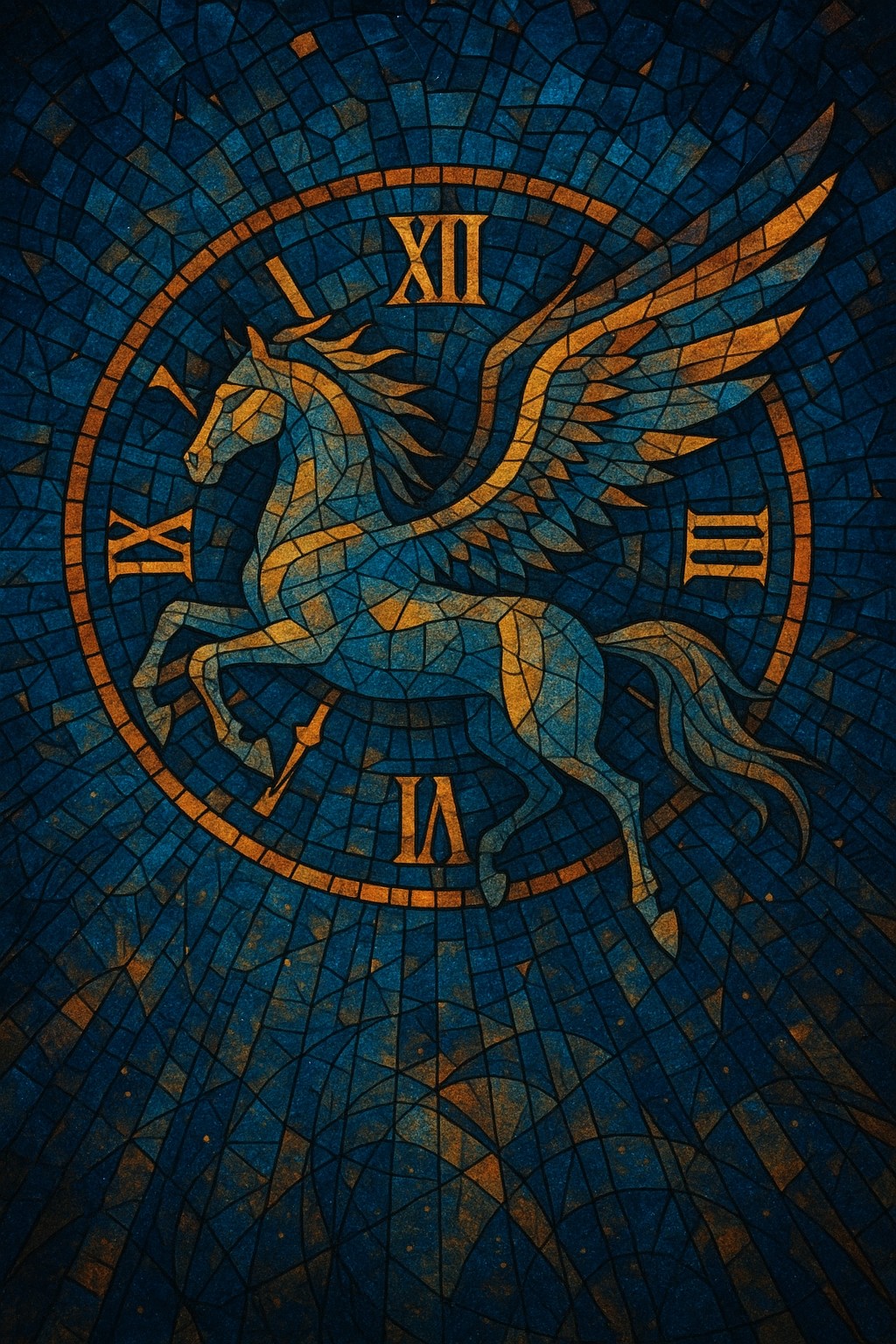 This image depicts a digital abstract mosaic of a majestic Pegasus mid-gallop, its wings outstretched in flight. The creature is formed from intricate polygonal stained-glass tiles in shades of deep blues, muted oranges, and golden yellows. Behind it, a large circular clock face with Roman numerals encircles the Pegasus, evoking the theme of time.