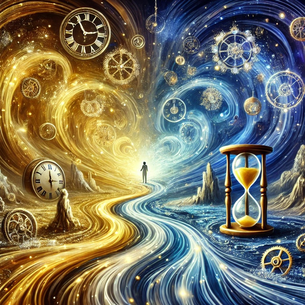River represents the flow of time itself. The river swirls with glowing symbols like clocks, hourglasses, and gears, flowing in a stream of golden and silvery light, blending past, present, and future. The water shimmers with shifting colors that represent the passage of time—gold for the past, silver for the present, and deep blues or purples for the future. The surrounding landscape feels surreal, with objects and figures fading in and out, emphasizing the fluid and ever-changing nature of time.