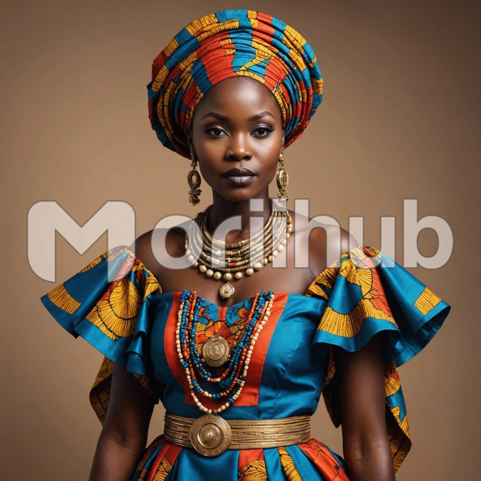 A stunning African woman stands confidently against a plain background, her presence radiating elegance. She wears vibrant, colorful attire that highlights her graceful figure, the intricate patterns reflecting cultural richness. Her headpiece, adorned with delicate beads and fabrics, crowns her hair beautifully, adding to her regal appearance. Elegant jewelry – shimmering earrings and a bold necklace – accentuates her look, each piece meticulously crafted. Her eyes shine with a quiet strength, and her serene smile exudes a timeless beauty, embodying both tradition and contemporary grace.