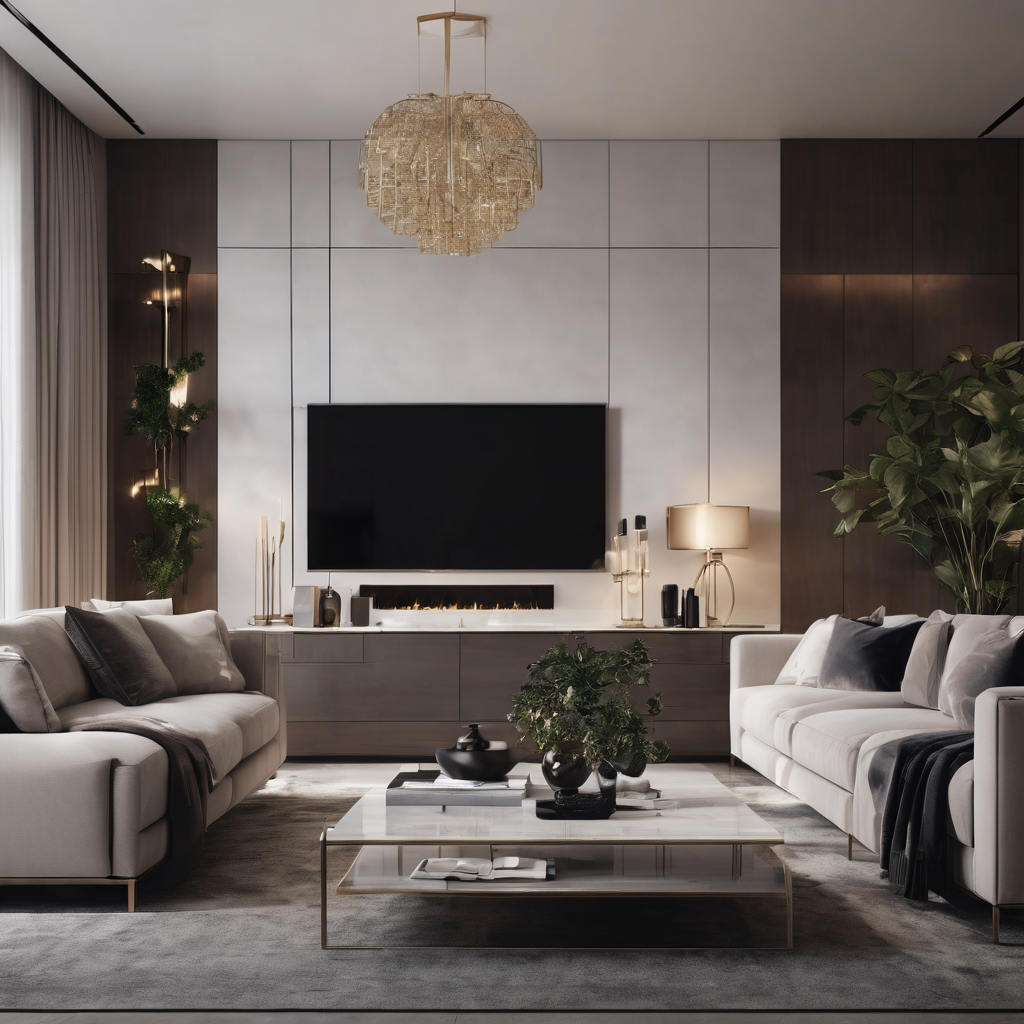 The living room exudes warmth and elegance with two plush couches framing a central coffee table, inviting intimate conversations or peaceful relaxation. Above, a dazzling chandelier adds a touch of sophistication, casting a soft glow across the room. The television rests quietly, unassuming, offering entertainment when desired but currently silent. It’s a space designed for comfort and connection, where moments of leisure unfold in a serene ambiance.
