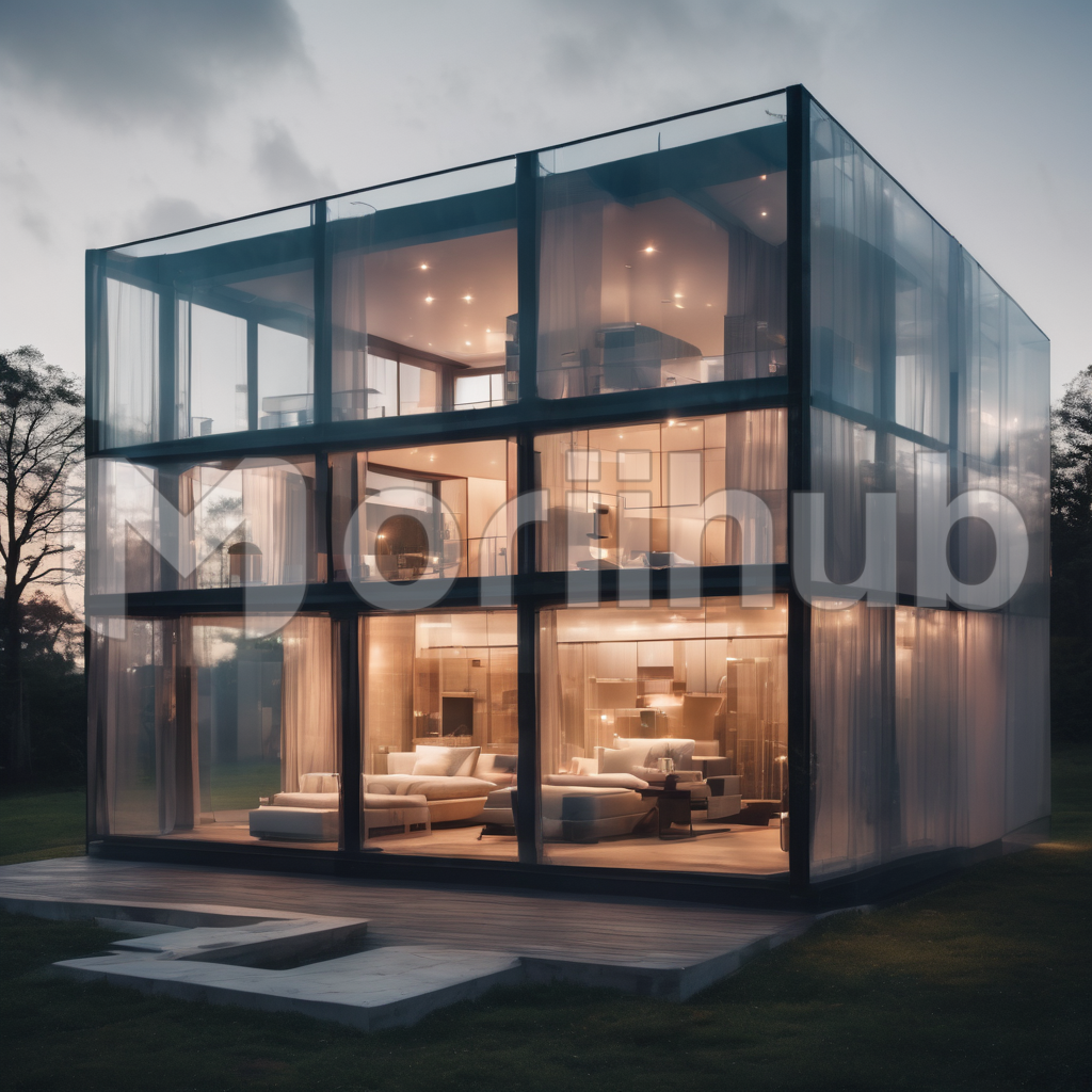 As dusk descends, a house of glass stands luminous against the darkening sky. Its transparent walls reveal the interior, where beds sit cozily on the ground floor. The warm glow from within casts a comforting aura, contrasting with the encroaching night. Despite the gathering darkness, the house remains a beacon of light and shelter, offering a glimpse of sanctuary amidst the changing landscape.
