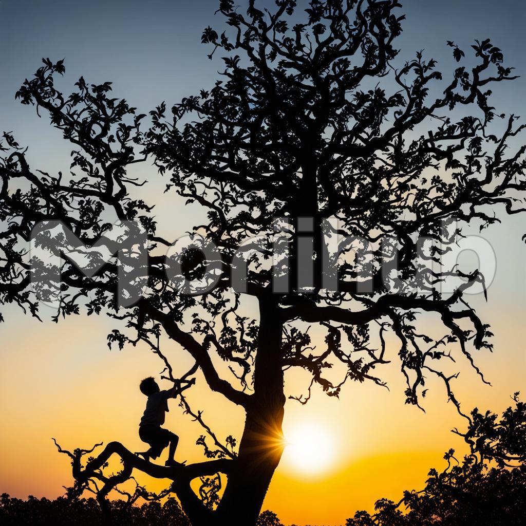 In the tranquil glow of a setting sun, a silhouette emerges against the warm hues of the sky. A determined boy, outlined by the fading light, ascends a sturdy tree with nimble grace. Each branch he conquers adds a poetic dance to the canvas of the evening. The sun, a fiery orb on the horizon, casts long shadows, enhancing the drama of his ascent. The harmonious blend of nature’s palette and the boy’s silhouette creates a timeless, ethereal scene, a fleeting moment captured in the twilight’s embrace.