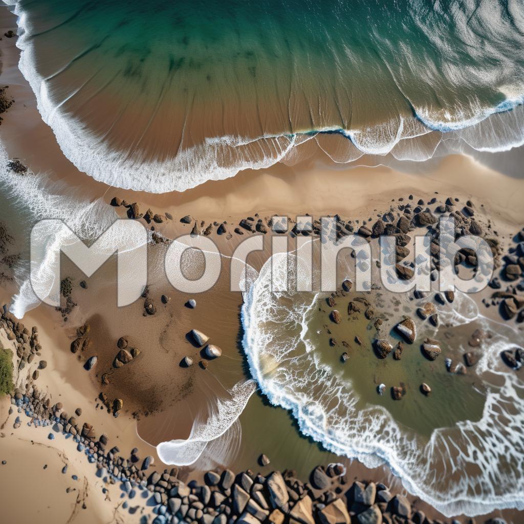 A panoramic view of the sandy beach stretches endlessly, with golden sand meeting the turquoise sea, framed by clear skies and gentle waves lapping the shore.
