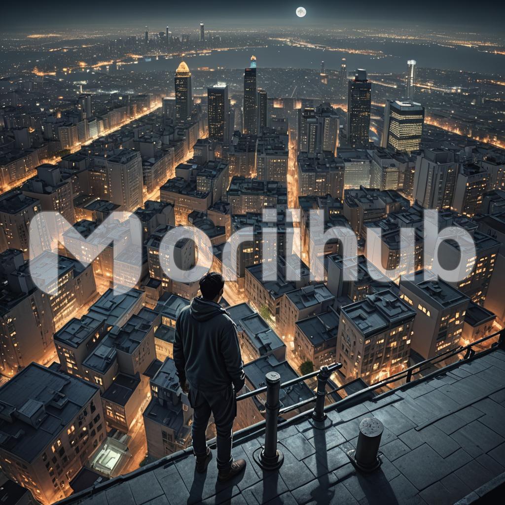 As twilight descends, a lone silhouette of a man stands atop a hill, gazing out at the sprawling city below. The sky is painted with shades of orange, pink, and purple, casting a mesmerizing glow over the urban landscape. Tall skyscrapers pierce the horizon, their windows twinkling like stars in the gathering dusk. The man’s posture is contemplative, hands in pockets, as he takes in the vastness of the city that never sleeps.