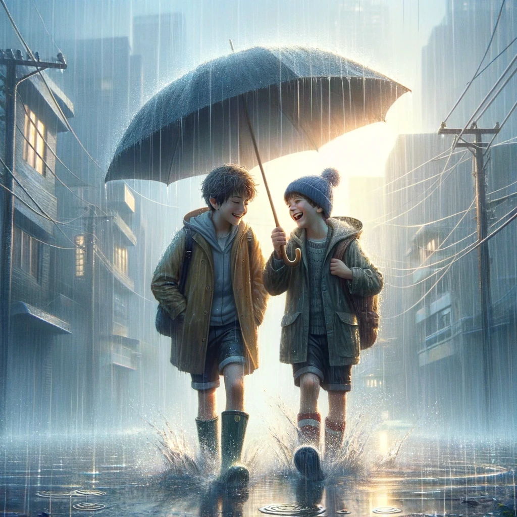 As the rain poured down in sheets, two boys walked side by side under a large umbrella, their laughter echoing through the misty air. With each step, they splashed through puddles, sending droplets flying in all directions. Despite the wet surroundings, their spirits remained high, finding joy in the simple pleasure of each other’s company.