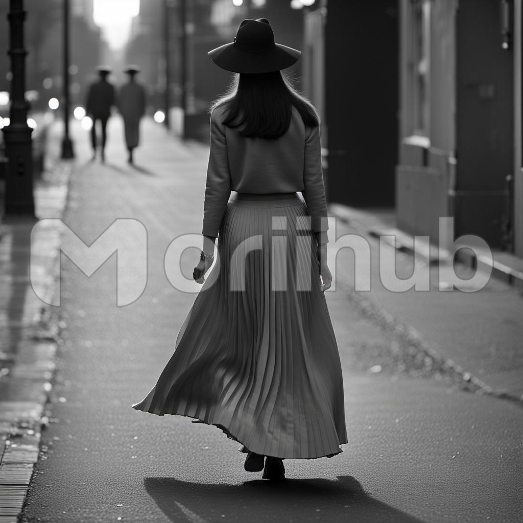 In the bustling cityscape, a stylish young woman with a sense of vintage flair strolls down the streets, her back adorned with a long pleated skirt, a chic hat, and a tailored long-sleeved shirt. Her confident stride speaks of individuality and grace. Ahead, two men in impeccably tailored suits stride into the distance, creating a dynamic tableau of urban sophistication. The rhythm of their steps and the woman’s unique style converge, capturing a moment where timeless elegance intersects with contemporary city life.