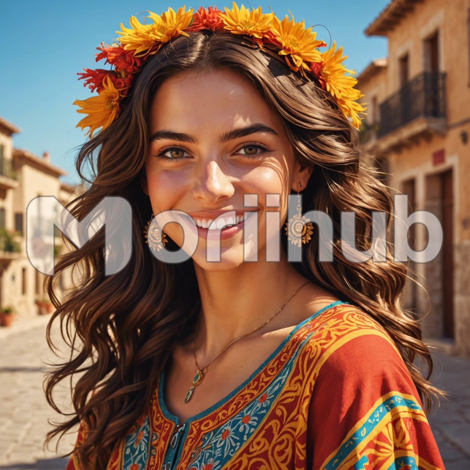 On a solitary street, a stunning woman graces the scene, her smile a beacon of warmth amidst the quietude. Adorned with a floral laurel in her hair, she embodies natural elegance. With each step, her presence paints the pavement with grace, a vision of serenity amid urban solitude. Her smile, like a blooming flower, radiates joy, casting light upon the shadowed alleys. In this solitary moment, she stands as a testament to the enduring beauty found in both nature and the human spirit.