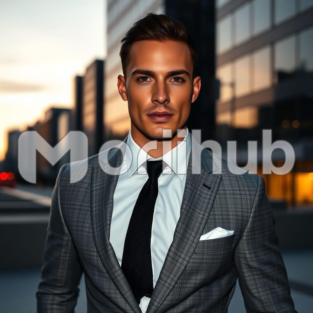 A man stands confidently, donning a well-tailored suit, looking ahead with a focused gaze. His posture reflects both poise and purpose as he stands against an urban backdrop, where buildings rise behind him under the soft evening light. The faint outlines of skyscrapers add a sense of depth and contrast, highlighting the calm confidence he exudes. The evening atmosphere lends a quiet ambiance to the scene, complementing his composed demeanor and professional appearance. His sharp look blends seamlessly with the cityscape, capturing a modern, elegant moment in time.