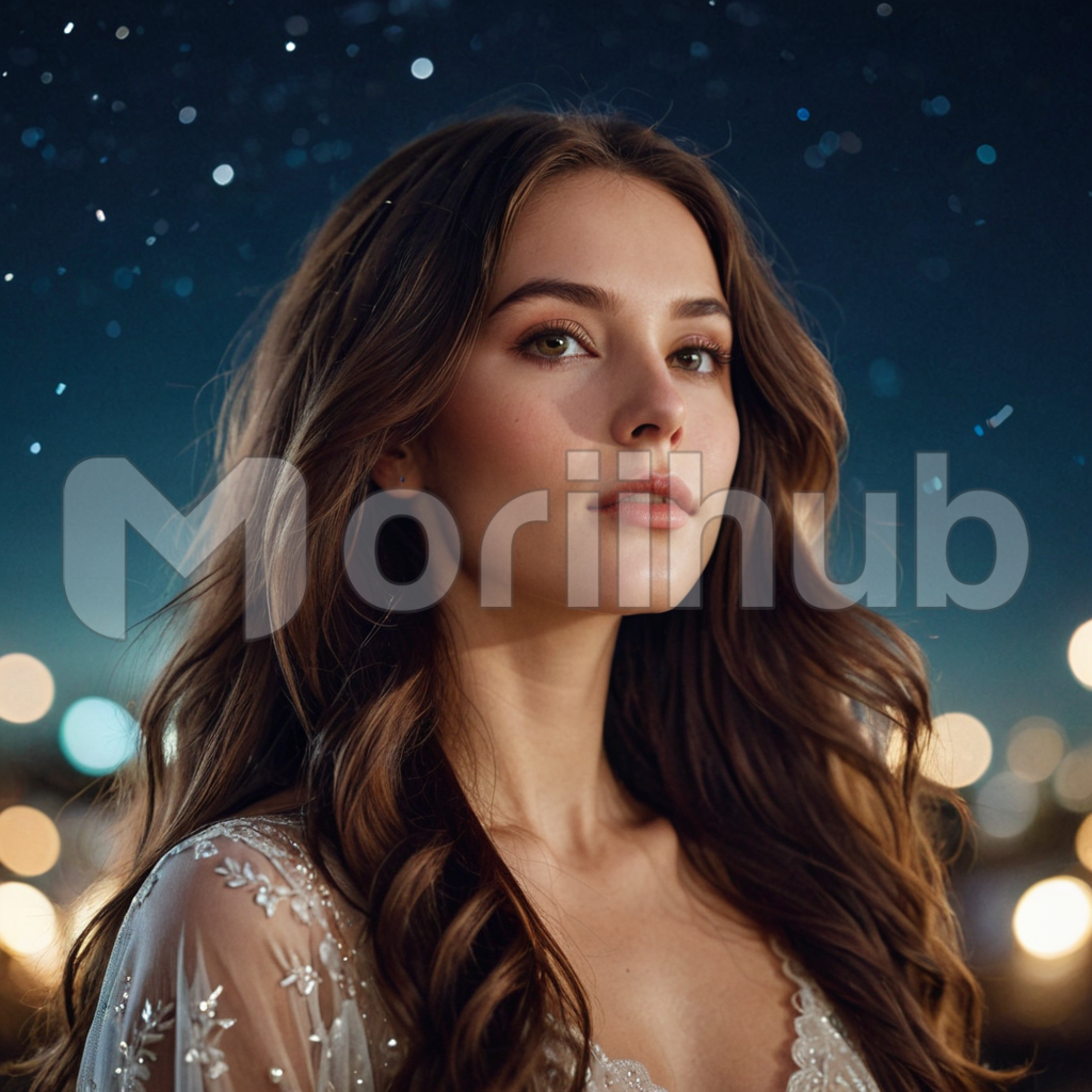 With grace in her demeanor, a beautiful woman gazes ahead, her eyes reflecting a blend of strength and tenderness. Her features, sculpted by elegance, captivate with an air of mystery. Silken strands of hair frame her face like cascading waves, adding to her allure. In her poised posture, there’s an aura of confidence, as if she holds the world in anticipation. Her presence commands attention, drawing admiration from all who behold her.