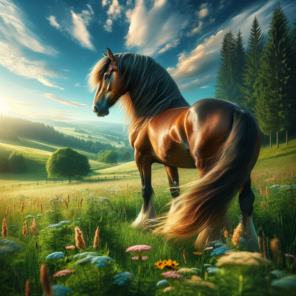 In the heart of a lush, green meadow, beneath a vast expanse of clear blue sky, stands a majestic horse, a paragon of grace and strength. Its sleek coat gleams in the sunlight, every muscle rippling with power. With head held high and mane flowing in the gentle breeze, it embodies the epitome of beauty and vitality, a timeless symbol of freedom and majesty amidst the tranquil embrace of nature.