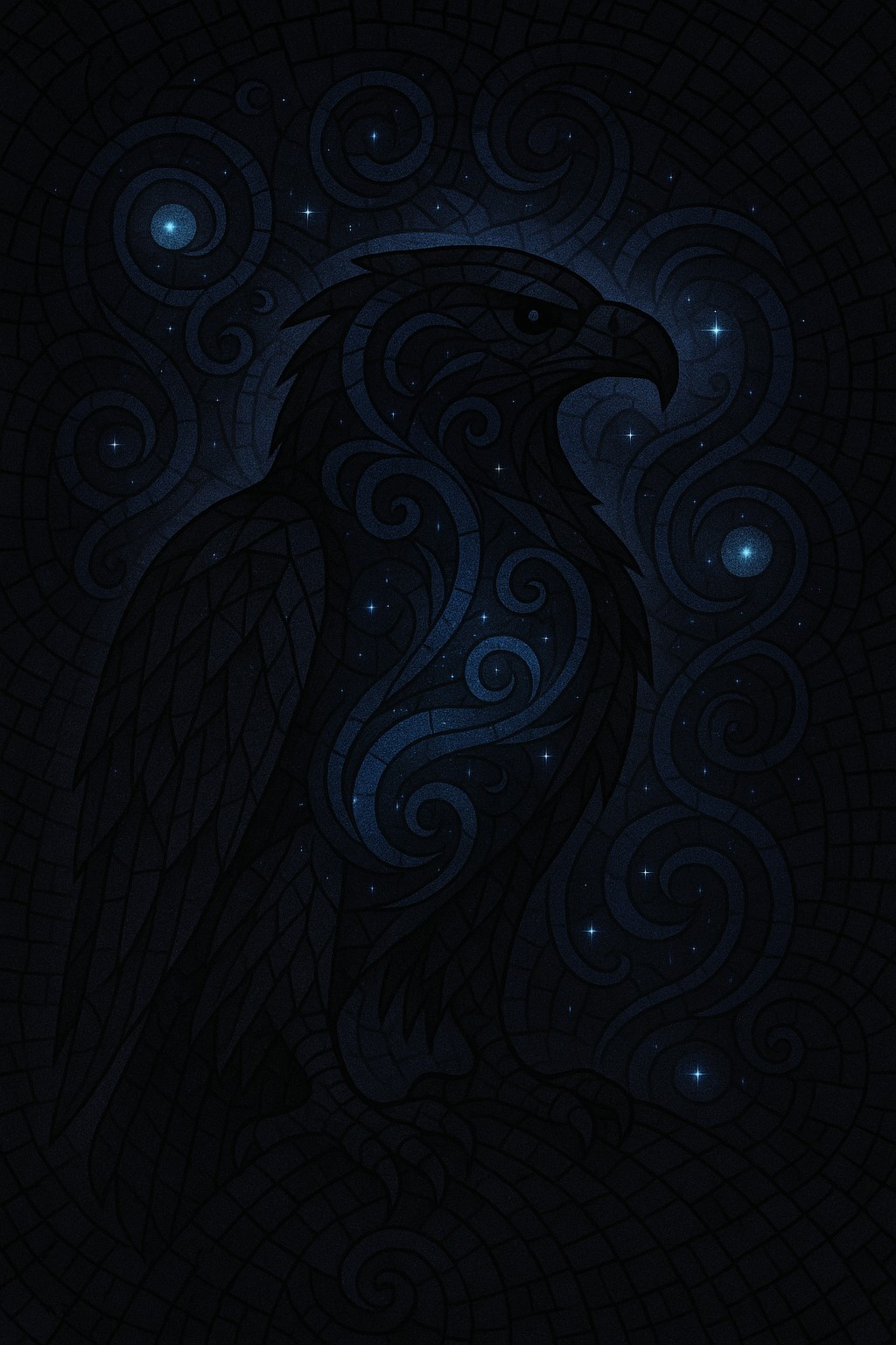 This digital abstract mosaic features a majestic eagle crafted from interlocking tiles in deep shades of black, indigo, and cosmic blue, embodying the essence of the void element. The eagle’s silhouette is strong and commanding, with swirling patterns and ethereal glows woven into its feathers, suggesting energy flowing through a celestial plane.