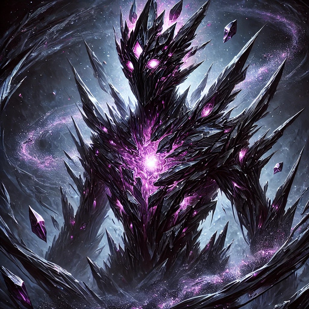 A towering elemental entity, sculpted entirely from dark, translucent crystal, infused with the essence of the void element. Its humanoid form is jagged and angular, with sharp crystal edges that reflect faint traces of cosmic light. The elemental’s body is riddled with cracks glowing in soft purples and blacks, as if the barely-contained void energy is seeping through the crystal shell.