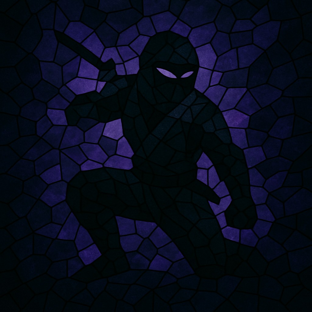 This image is a digital abstract mosaic depicting a ninja composed of irregular, polygonal fragments resembling stained glass. The ninja is in a dynamic, crouched pose, holding a sword angled diagonally across the body. The figure is formed using dark shades of black and deep gray, while the background radiates with glowing purples and violets, creating a powerful contrast that evokes the mystical void element.