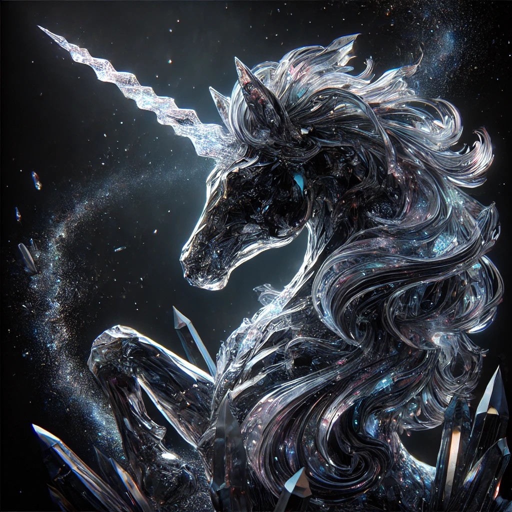 A mesmerizing crystalline sculpture of a unicorn, shaped from translucent crystal with sharp, jagged facets, giving it an ethereal, otherworldly appearance. The unicorn’s elegant form is highlighted by a flowing mane and tail, intricately detailed with delicate facets. The crystal shimmers in deep, swirling hues of black, midnight purple, and specks of white, symbolizing the void element. The unicorn’s horn is long and twisted, radiating dark, mystical energy that seems to draw in light from the surroundings. A swirling, void-like aura emanates from the horn, distorting the air around it.