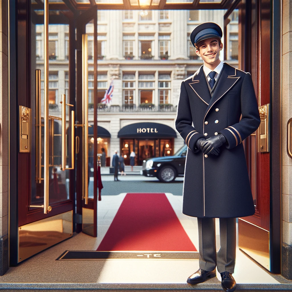 At the entrance of a luxurious hotel stands a doorman, the epitome of elegance and hospitality. Dressed in a traditional uniform, he exudes professionalism and grace as he greets guests with a warm and welcoming smile. His presence adds a touch of class to the grandeur of the hotel, ensuring every arrival is met with the utmost care and attention.