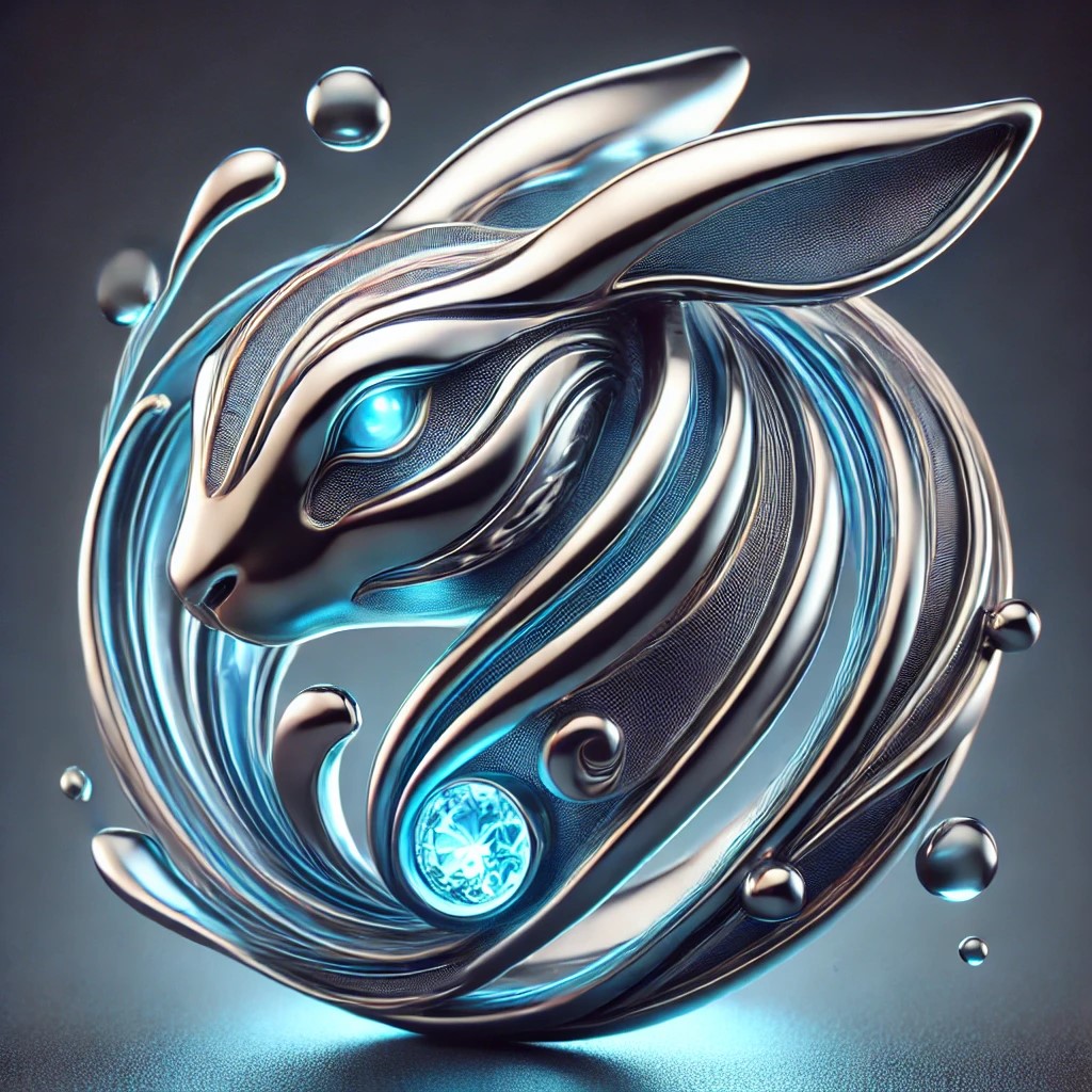 Water rabbit ring features a beautifully crafted rabbit, with its body and long ears shaped from sleek metallic elements that flow in dynamic, wave-like patterns. Glowing blue water lines run through the rabbit’s form, symbolizing its connection to water and nature. The rabbit’s softly glowing eyes add a mystical touch, while an embedded blue gemstone represents agility, gentleness, and curiosity.