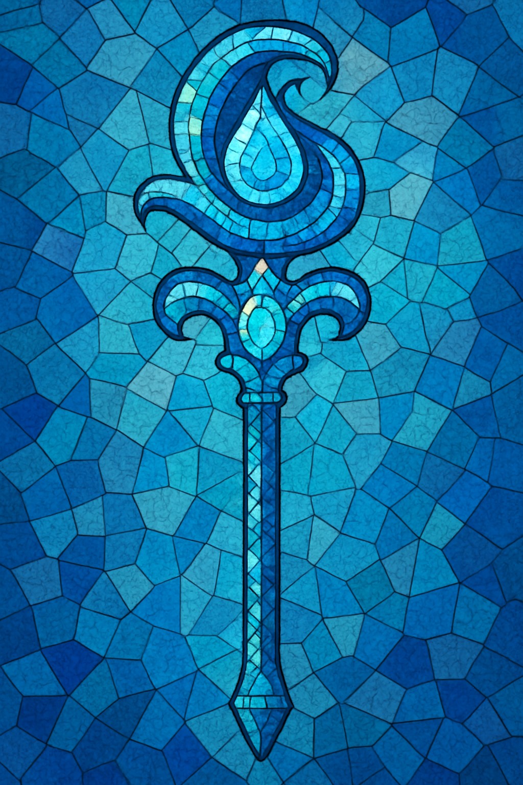 This digital abstract mosaic depicts a majestic scepter shaped entirely from tessellated tiles in shades of blue, turquoise, and deep teal, embodying the essence of the water element. The scepter’s head features a prominent water droplet encased in elegant, swirling forms that evoke the fluidity and motion of waves. Intricate geometric patterns run along the shaft, reinforcing the mystical and regal nature of the artifact.