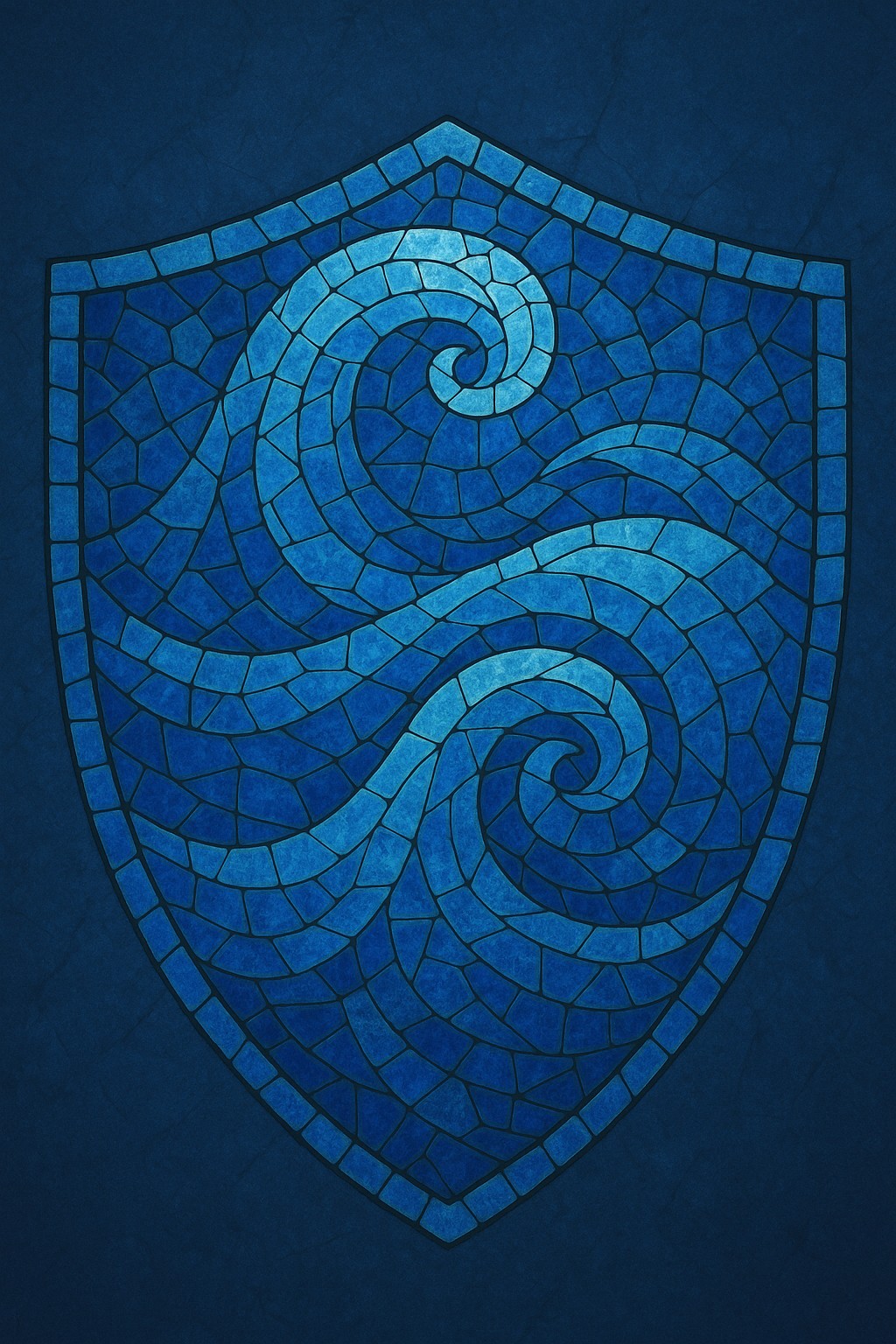 This image is a digital abstract mosaic in the shape of a shield, visually representing the water element. The mosaic is made of tessellated glass tiles in varying shades of blue, from light turquoise to deep ocean blue. These tiles form swirling, wave-like patterns that evoke the motion and fluidity of water. Each piece is outlined with fine dark lines, giving it a stained-glass effect and creating a three-dimensional look.