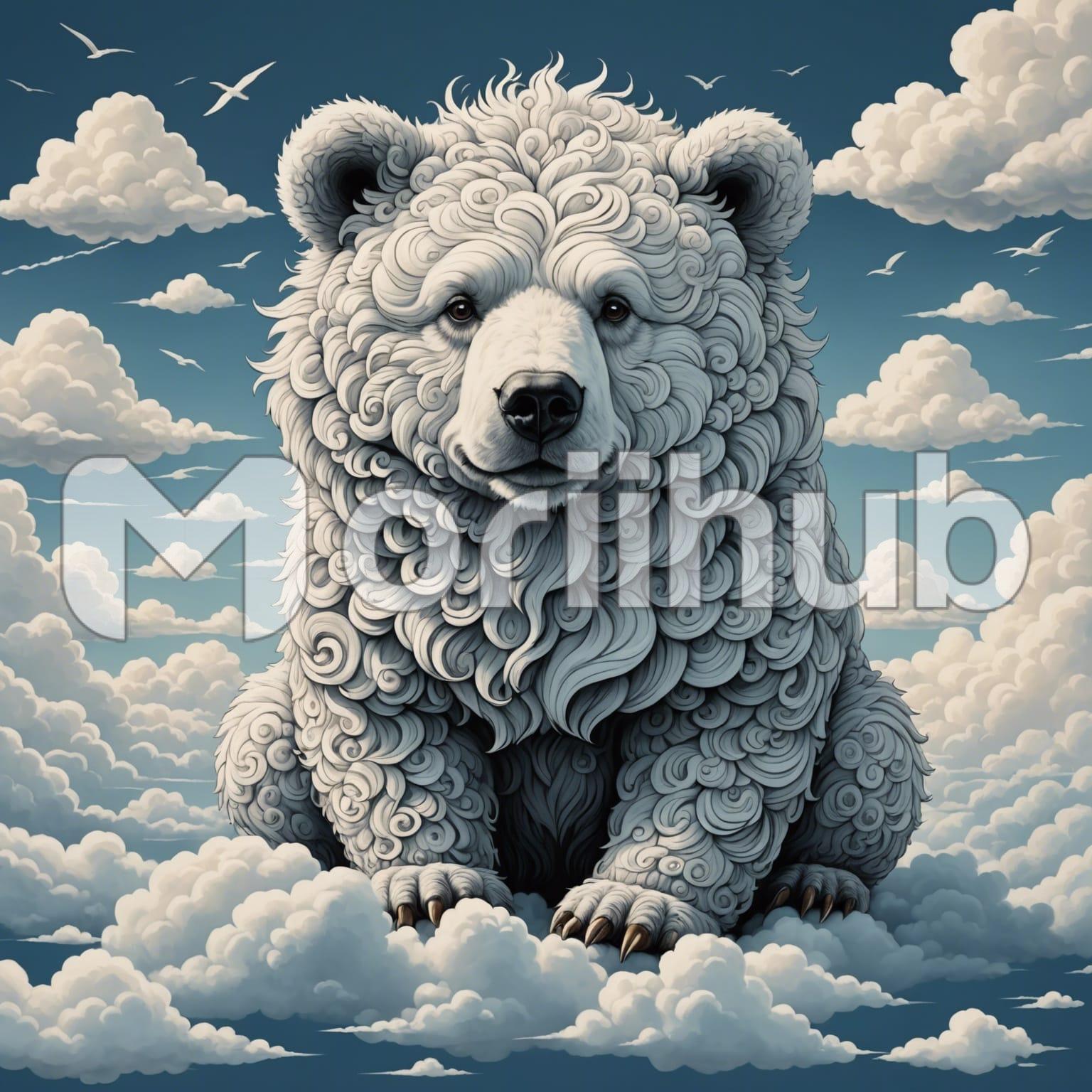 In a whimsical art piece, a fluffy bear crafted from clouds sits perched atop a billowy white cloud. Its form, a blend of soft edges and gentle curves, exudes an air of playful charm. With paws folded neatly in front, it gazes out with eyes that sparkle like dewdrops in the sunlight. Surrounding it, the clouds swirl and dance, forming an ethereal backdrop that adds to the enchantment of the scene. In this dreamlike creation, imagination takes flight, inviting viewers into a world where fluffy bears roam among the clouds.