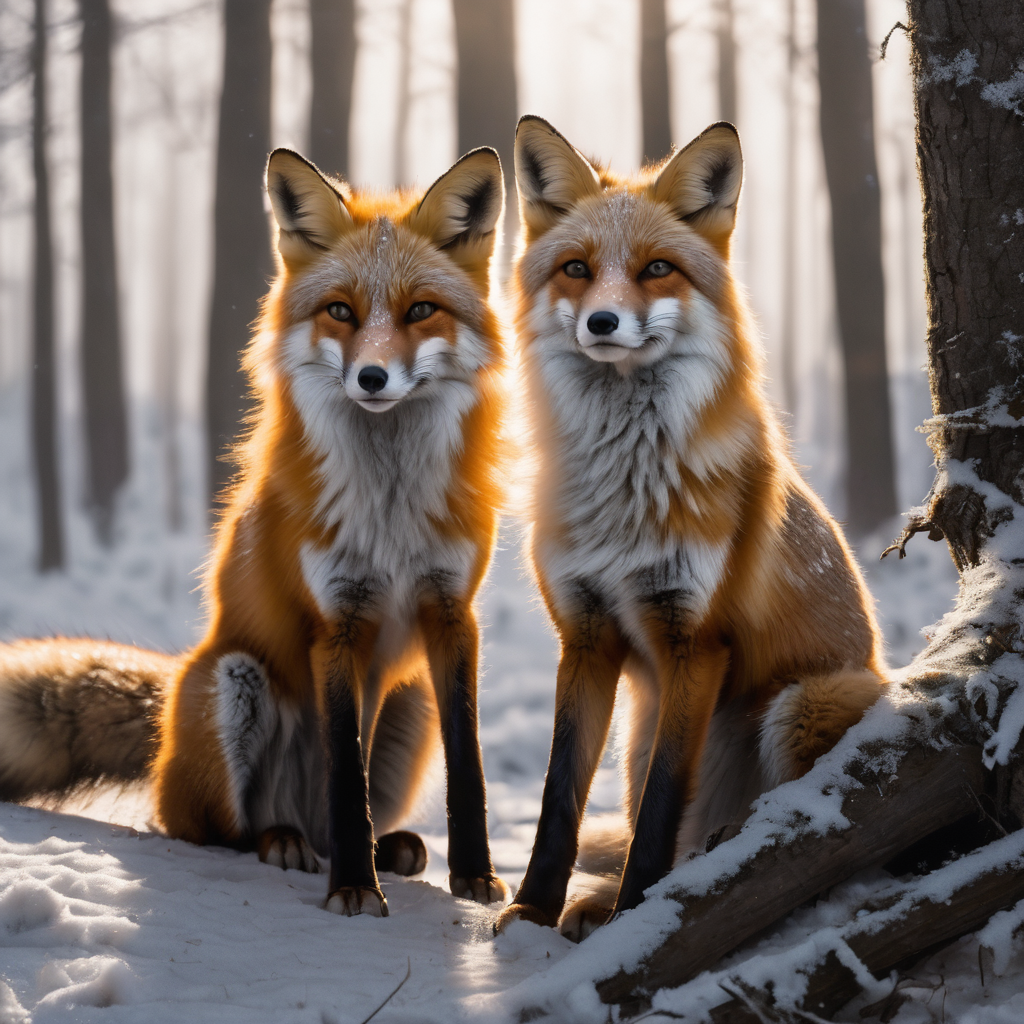 Amidst the woods, a pair of foxes dart gracefully, their russet fur blending with the dappled sunlight filtering through the canopy. With agile steps, they navigate the forest floor, tails brushing against fallen leaves in a silent dance. Their keen eyes gleam with intelligence and curiosity, ever watchful for signs of prey or danger. Together, they embody the untamed spirit of the wilderness, a fleeting glimpse of nature’s beauty and resilience.