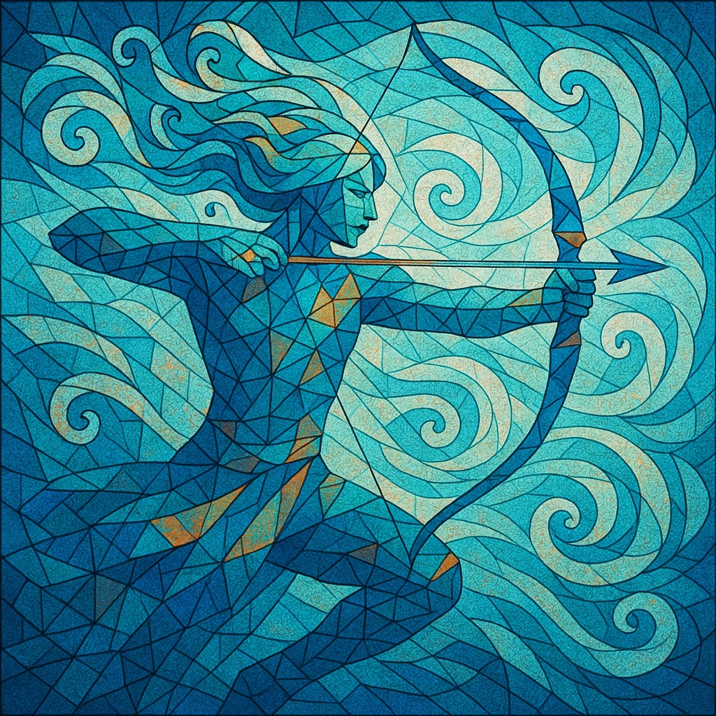This digital abstract mosaic features a stylized archer crafted entirely from geometric shapes and vibrant color patterns. The archer is depicted mid-action, bow drawn and aimed, their body composed of angular polygons that create a sense of movement and tension. Flowing lines and swirling motifs in the background suggest the element of wind, adding a dynamic atmosphere to the piece.