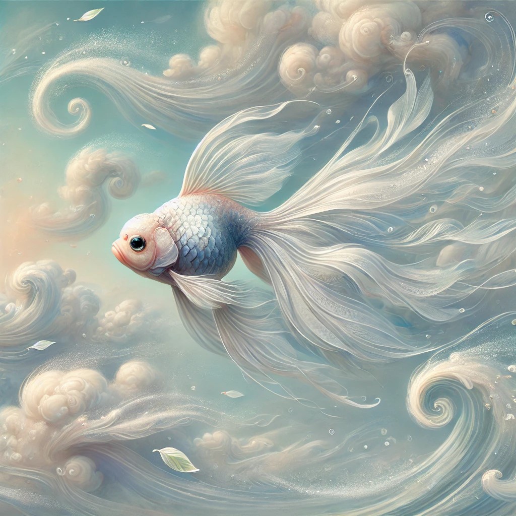 A whimsical, airy scene featuring a wind goldfish that embodies the essence of wind. The goldfish has delicate, almost transparent fins and scales that ripple like flowing air. Its body shimmers with soft hues of white, pale blue, and silver, and it appears to be gliding through an invisible current. The background is a swirling sky filled with gentle breezes, wispy clouds, and floating leaves.
