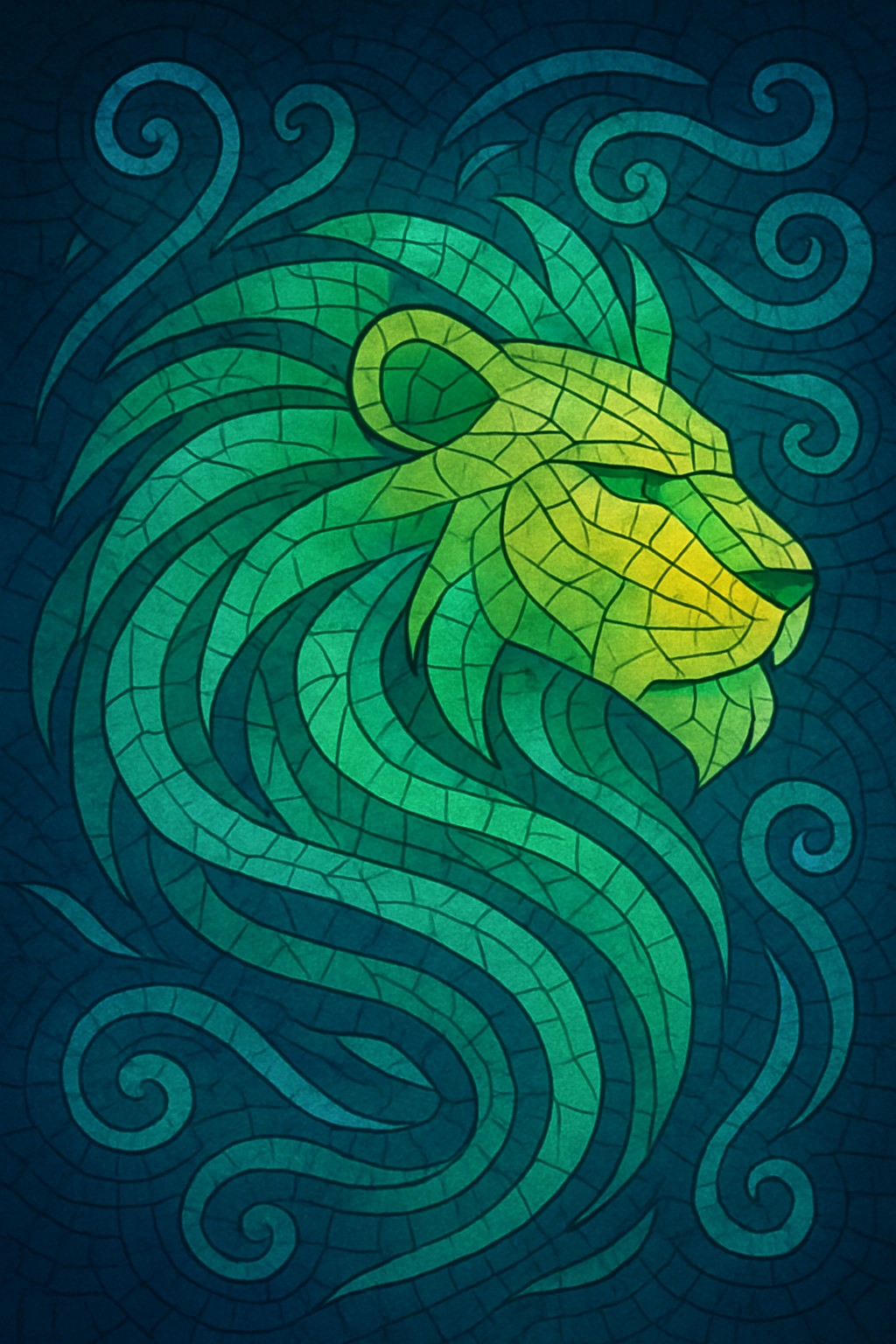 This digital abstract mosaic features a regal lion’s head, composed of elegant, tessellated tiles in shades of green, teal, and soft yellow, evoking the essence of the wind element. The lion is shown in profile, its expression calm yet powerful, symbolizing silent strength and grace. Its mane flows outward in sweeping, curved patterns that echo gusts of wind, seamlessly blending with the swirling, turquoise air currents in the background.