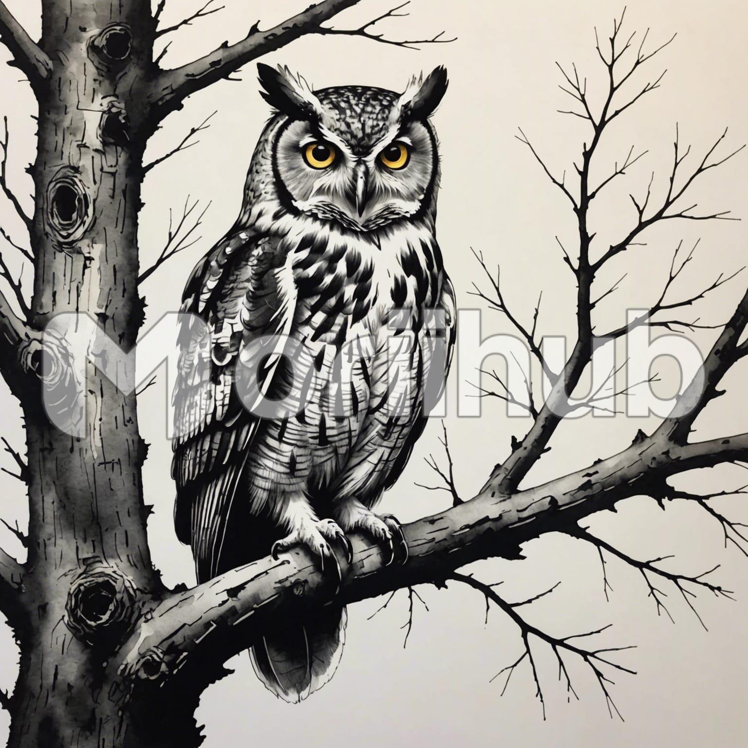 In an ink painting, an owl perches on a withered tree branch, its presence evoking a haunting beauty. The stark contrast of black ink captures the owl’s sharp silhouette and intricate details with striking clarity. The withered branch twists and bends, its textures conveyed through bold strokes that add to the painting’s raw and rugged charm. The owl’s piercing eyes stare out from the scene, imbuing it with a sense of ancient wisdom and quiet resilience, set against a backdrop of subdued ink washes that suggest a misty, ethereal atmosphere.