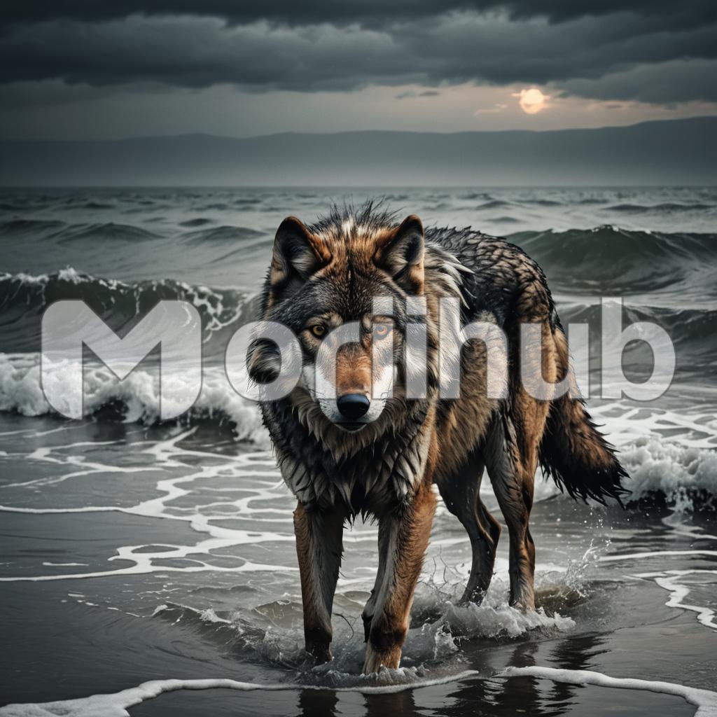 A wolf at the seaside creates a striking and rare image, blending the wild with the serene. The majestic predator, typically associated with forests and mountains, stands out against the backdrop of rolling waves and sandy shores. Its keen eyes scan the horizon, ears alert to the sounds of the ocean. The contrast between the untamed wilderness of the wolf and the tranquil beauty of the beach is captivating. This unusual setting highlights the adaptability and resilience of wolves, capable of exploring diverse environments. The scene evokes a sense of awe and wonder, reminding us of the profound connections between all creatures and their habitats.