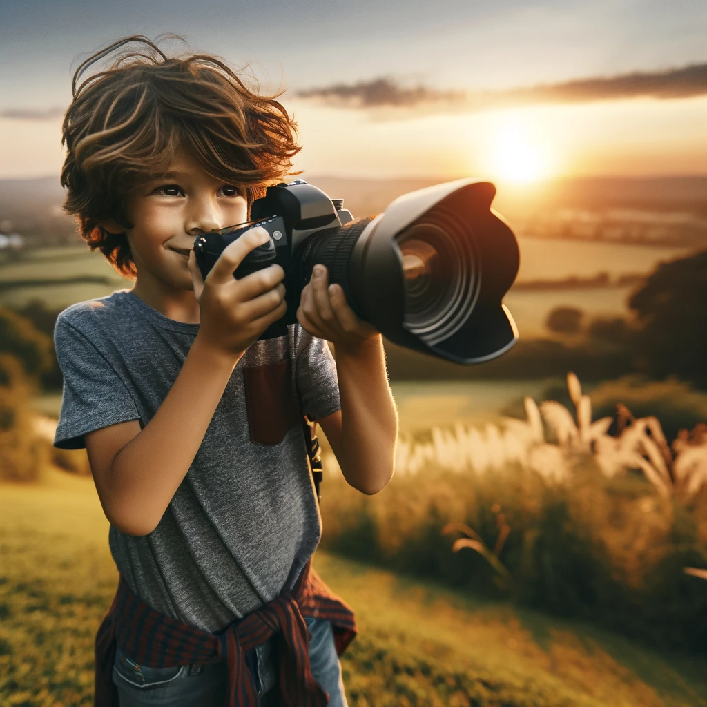 Atop the grassy knoll, bathed in the warm glow of sunset, stands a spirited young adventurer, aged around 12. His eyes sparkle with curiosity, his eager expression mirroring the vibrant hues of the sky. Dressed in casual, modern attire, he exudes a contagious energy, ready to explore the world’s wonders.