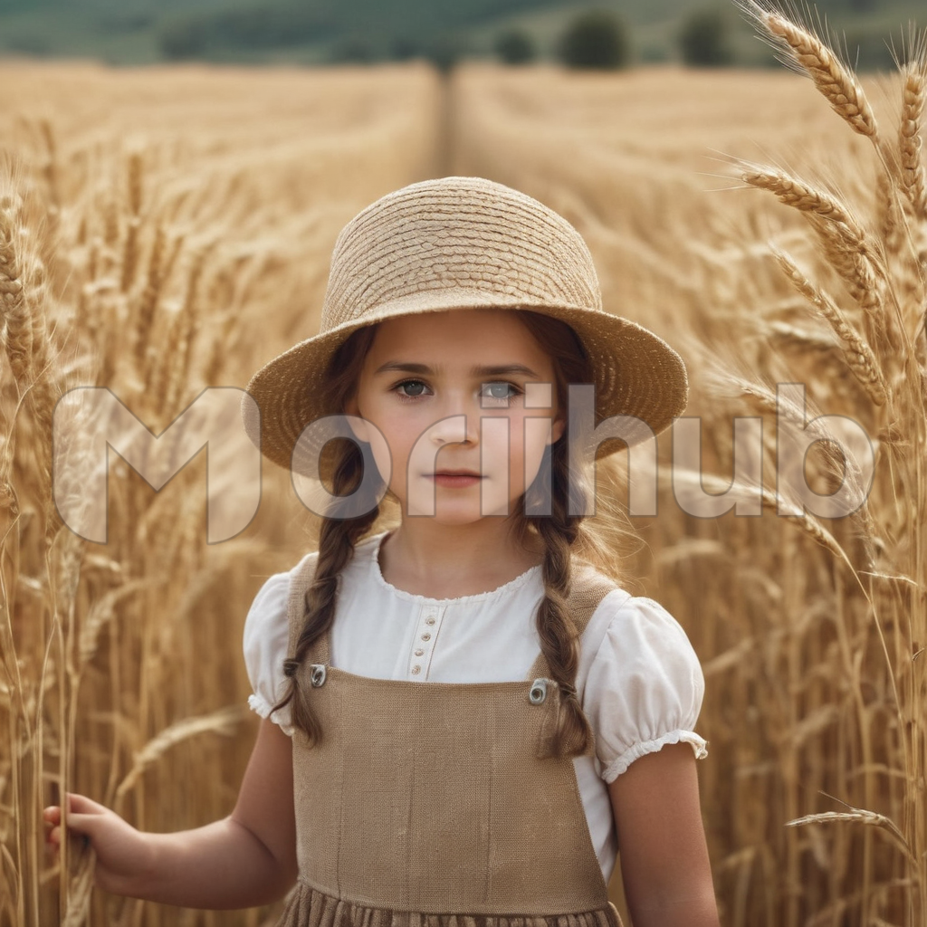 Amidst the golden waves of a wheat field, a charming little farm girl stands, her small hands cradling a stalk of wheat. A straw hat sits atop her head, casting a shadow over her two playful ponytails. Her presence is a picturesque embodiment of youthful innocence, radiating with the rustic charm of rural life, amidst the bounty of the flourishing farm.