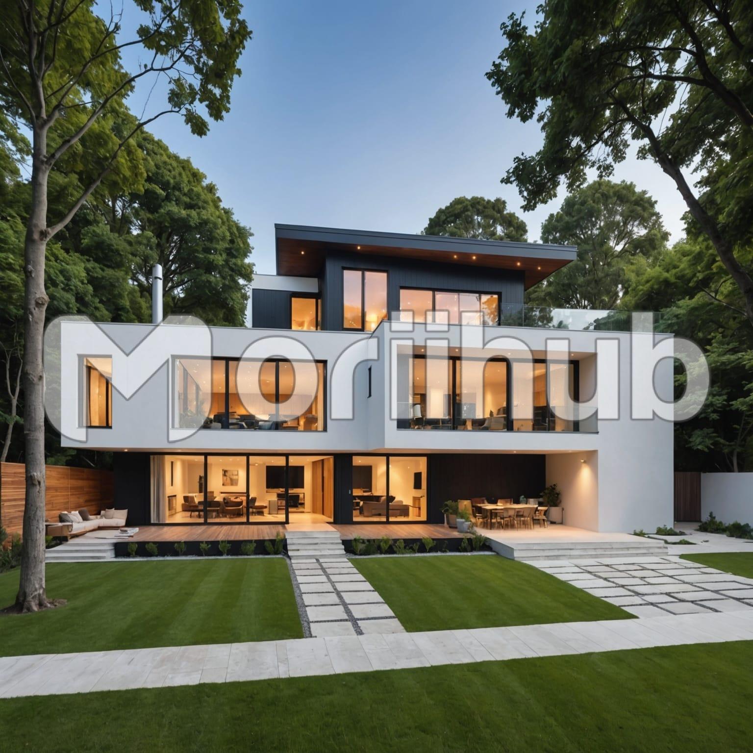 A cozy house stands under a clear blue sky, its silhouette softened by the warm light. Large glass windows glow invitingly, revealing the soft light inside and casting a welcoming ambiance to the scene. The house’s clean lines and wooden exterior give it a modern yet homely feel. In the corner of the view, tall trees sway gently, their green leaves rustling softly in the breeze. The contrast between the illuminated interior and the vibrant, natural surroundings creates a peaceful, inviting atmosphere in the warmth of the day.