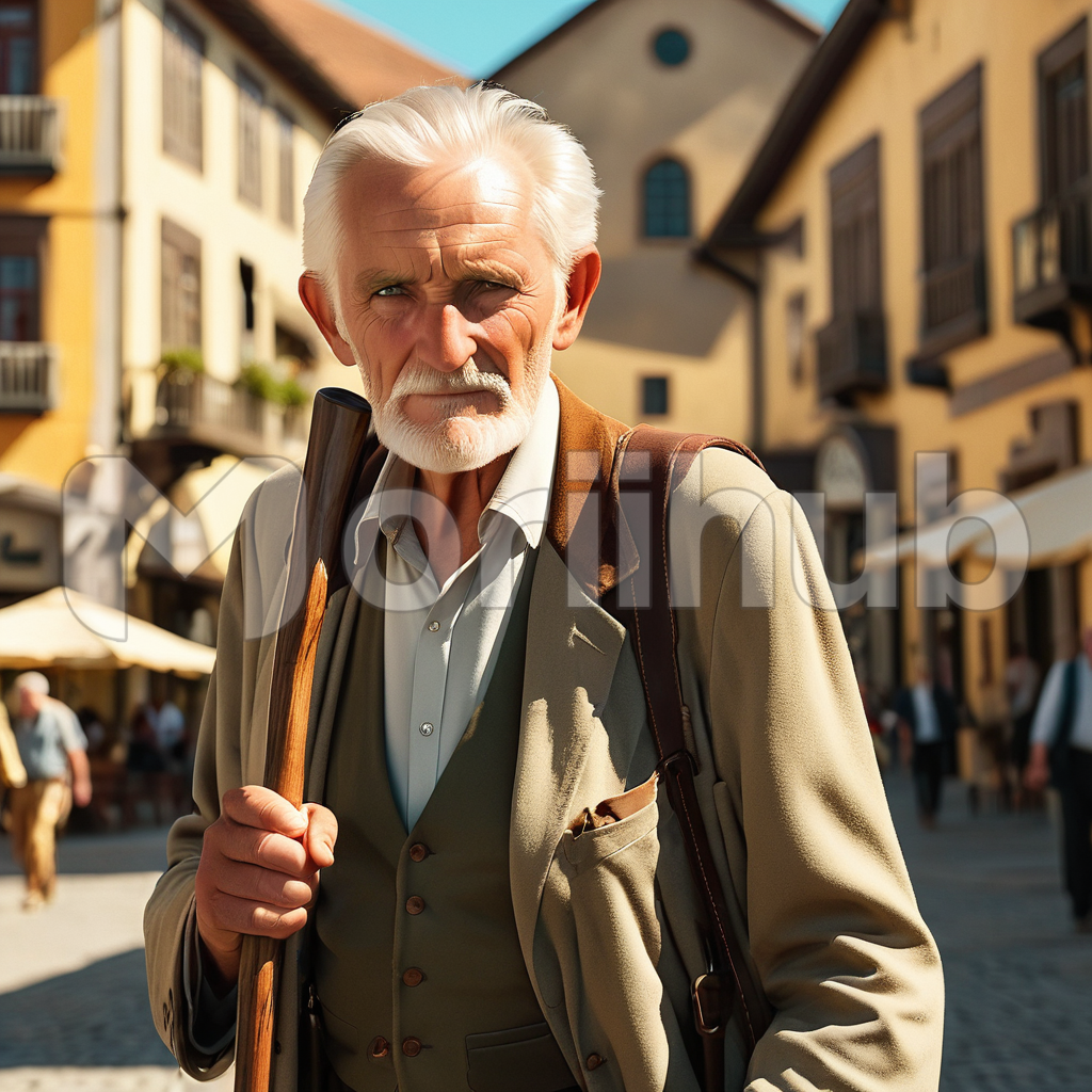In the bustling streets, an elderly man stands stoically, leaning on his trusty cane for support. Time has etched lines of wisdom on his weathered face, yet his eyes sparkle with life’s enduring spirit. Despite the bustling crowd, he remains a solitary figure, his presence a testament to resilience and perseverance. With each step, he embodies the quiet strength that comes from a lifetime of experience and the wisdom of age.