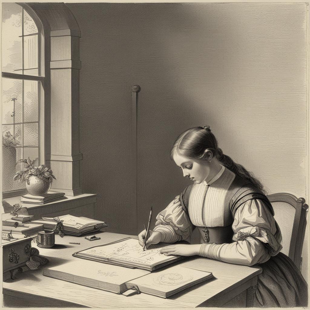 In the serene hush of her study, a woman of refined grace sits at her desk, bathed in the soft chiaroscuro of sunlight filtering through an opened window. The monochrome scene captures the essence of 1800s elegance, as quill gracefully meets parchment. A delicate vase cradles petite flowers at the corner of her meticulously arranged workspace, a testament to the artistry of her contemplative pursuits. The atmosphere resonates with timeless sophistication, a vignette frozen in the delicate dance of ink and sunlight.