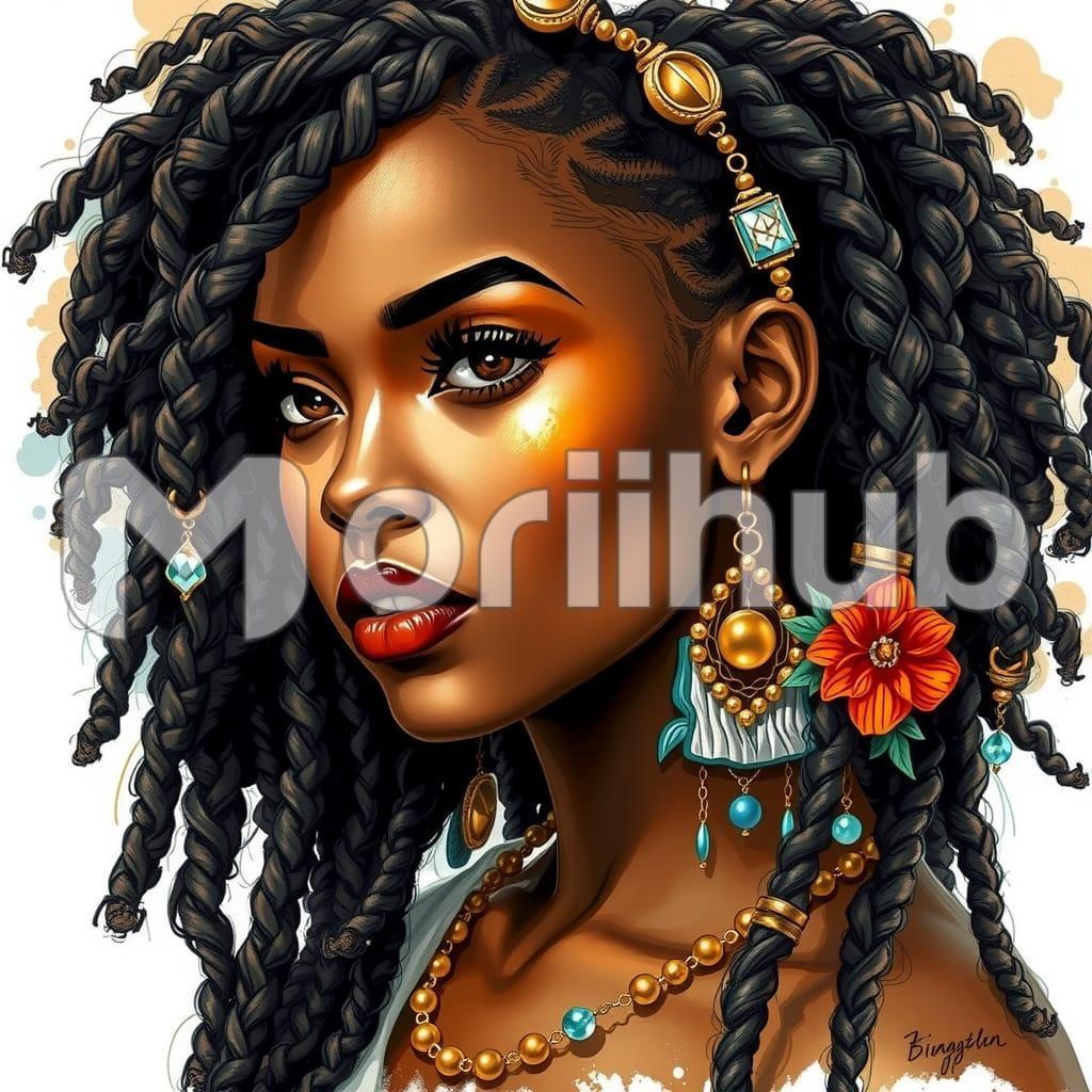 The detailed drawing captures an elegant ebony woman with intricate braided hair, each braid meticulously crafted to highlight its texture and flow. Her gaze is serene yet captivating, directed slightly off to the side. Adorning her hair are delicate pieces of jewelry, adding a touch of shimmer and sophistication. Her ears are embellished with exquisite earrings, and her neck is adorned with a graceful necklace that complements her overall poise. The artist’s attention to detail brings out the richness of her features and the splendor of her adornments.