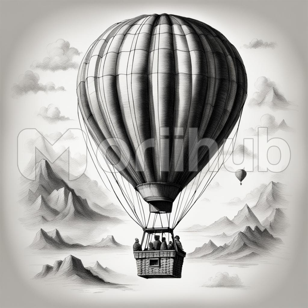 In the intricate lines of a pencil sketch, a hot air balloon takes flight, its graceful form suspended against the backdrop of a distant mountain range. Within its colorful canopy, tiny figures peer out, their excitement palpable as they soar above the earth. Below, jagged peaks rise majestically, their rugged outlines contrasting with the serene expanse of the sky. The sketch captures a moment of adventure and wonder, where human ingenuity meets the untamed beauty of nature.