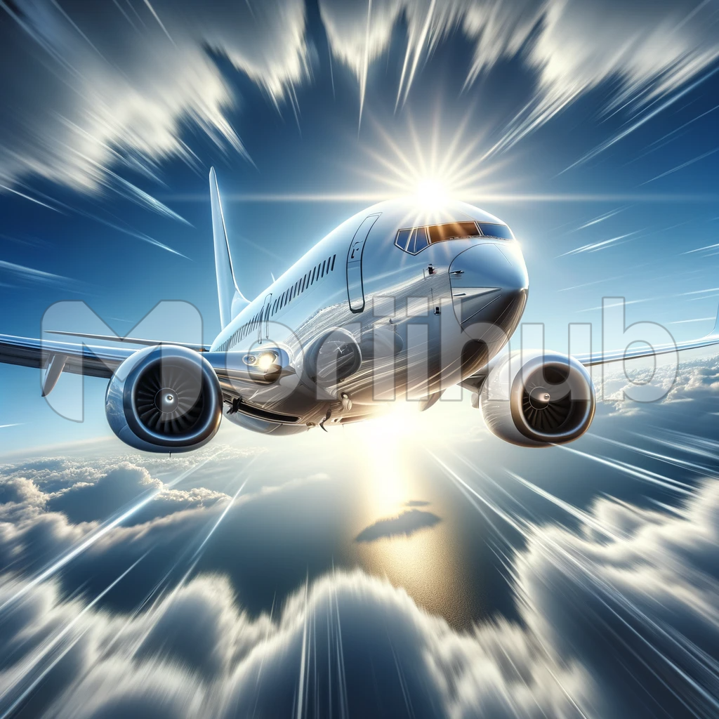 Amidst the boundless canvas of the sky, a dynamic image unfolds. A modern and sleek passenger airplane, with a pristine white fuselage, dominates the horizon. Its streamlined form exudes sophistication, while distinctive airline markings add a touch of identity. Against the endless blue expanse, the aircraft soars with purpose, a symbol of human ingenuity and the thrill of exploration. Its powerful engines roar with life, propelling it through the atmosphere as it carries passengers to distant destinations. In this airborne marvel, the spirit of adventure and the marvels of technology come together to paint an awe-inspiring picture in the open heavens.