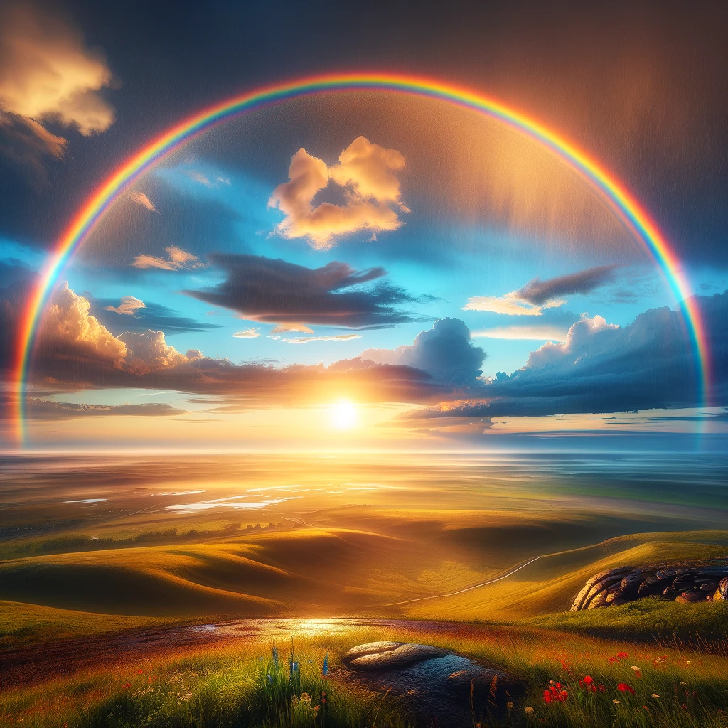 As the rain shower subsides, the sky transforms into a canvas of wonder, adorned with a breathtaking sight: a vibrant, full arc rainbow stretching majestically across the horizon. Each hue is a brushstroke of nature’s artistry, painting the heavens with kaleidoscopic brilliance. It’s a moment of pure enchantment, where the beauty of the natural world shines with unparalleled splendor.