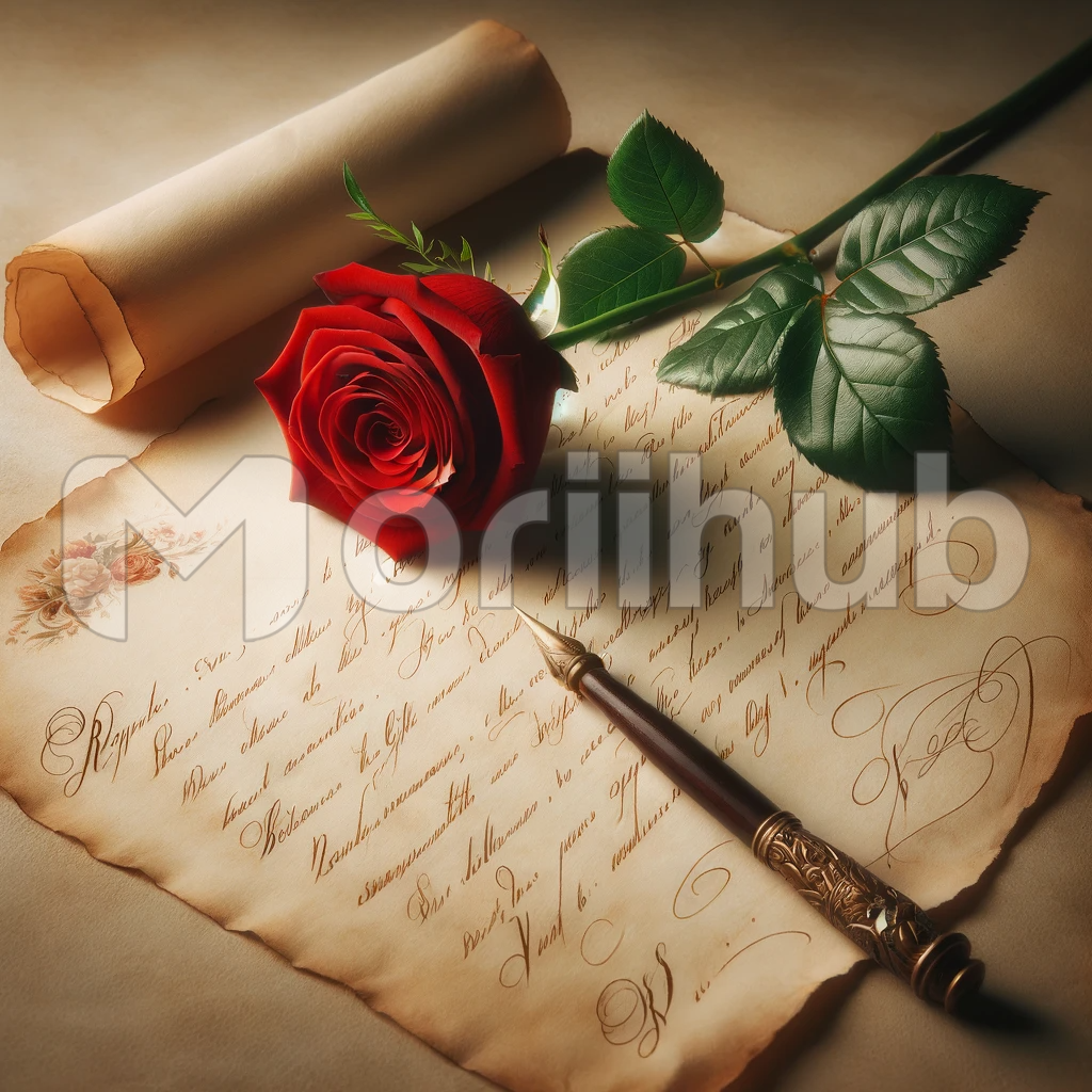 In this heartwarming scene, a single, exquisite red rose lies gently atop a handwritten love letter. The letter, penned on aged, cream-colored paper, exudes elegance and sentiment. The delicate curves of the script speak of affection, and the rose’s deep crimson hue symbolizes love’s passion. Together, they form a timeless and romantic gesture, capturing the essence of devotion and heartfelt emotion.