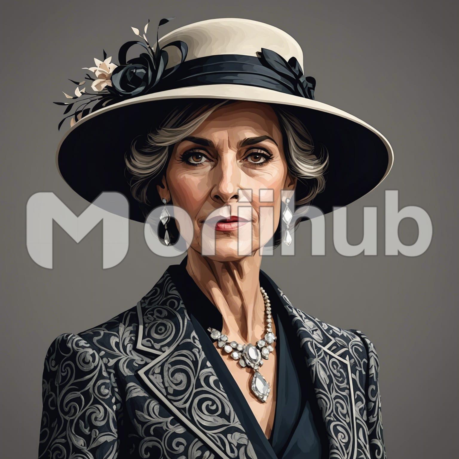 In the portrait, an elegant middle-aged woman graces the scene with timeless sophistication. Her poised demeanor exudes confidence, while her eyes sparkle with wisdom and grace. A hat, perched atop her head at a chic angle, adds a touch of flair to her ensemble, accentuating her refined style. Every detail, from the delicate lines of her face to the intricate design of her attire, speaks of a life well-lived and a spirit unbound by time. She embodies elegance and poise, a vision of beauty captured in a single frame.