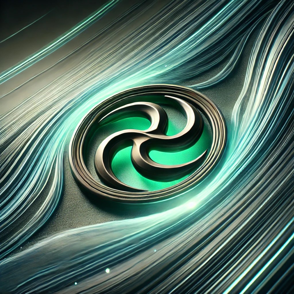 An agility rune carved into a sleek, fluid surface. The rune features flowing, curved lines that symbolize speed, grace, and nimbleness, resembling the swift movements of wind or water. It glows with a bright, emerald green and silver light, radiating energy and fluidity. The surface is smooth and dynamic, with subtle ripples or waves, emphasizing the agility and swift movement.