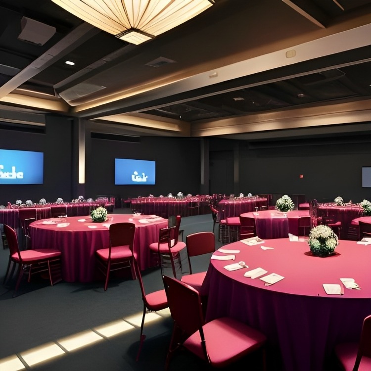 At the exquisite event center, vibrant red round tables adorned with elegant linens create a visually stunning atmosphere. The soft glow of carefully placed decor lights enhances the ambiance, casting a warm and inviting glow. This meticulous attention to detail transforms the space into a breathtaking setting for memorable and beautiful occasions.