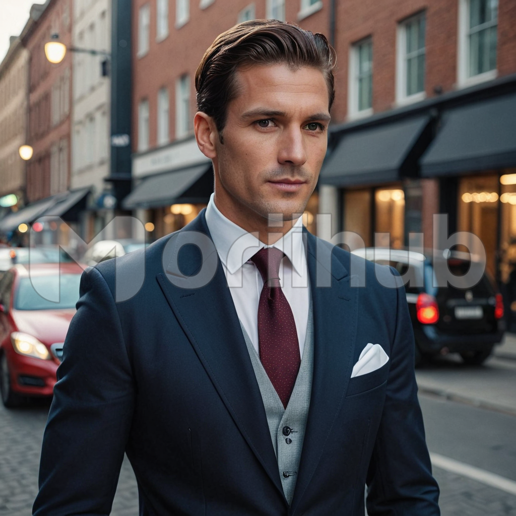 A man in a well-fitted suit stands on the sidewalk, his gaze fixed intently ahead. Behind him, the urban street buzzes with activity, vehicles blurring in motion. His suit, impeccably tailored, complements his poised stance. He wears a crisp shirt and a neatly knotted tie, enhancing his professional demeanor. Despite the busy traffic around him, he remains a solitary figure of calm and focus, embodying a quiet confidence amidst the dynamic hustle of the city’s continuous flow.